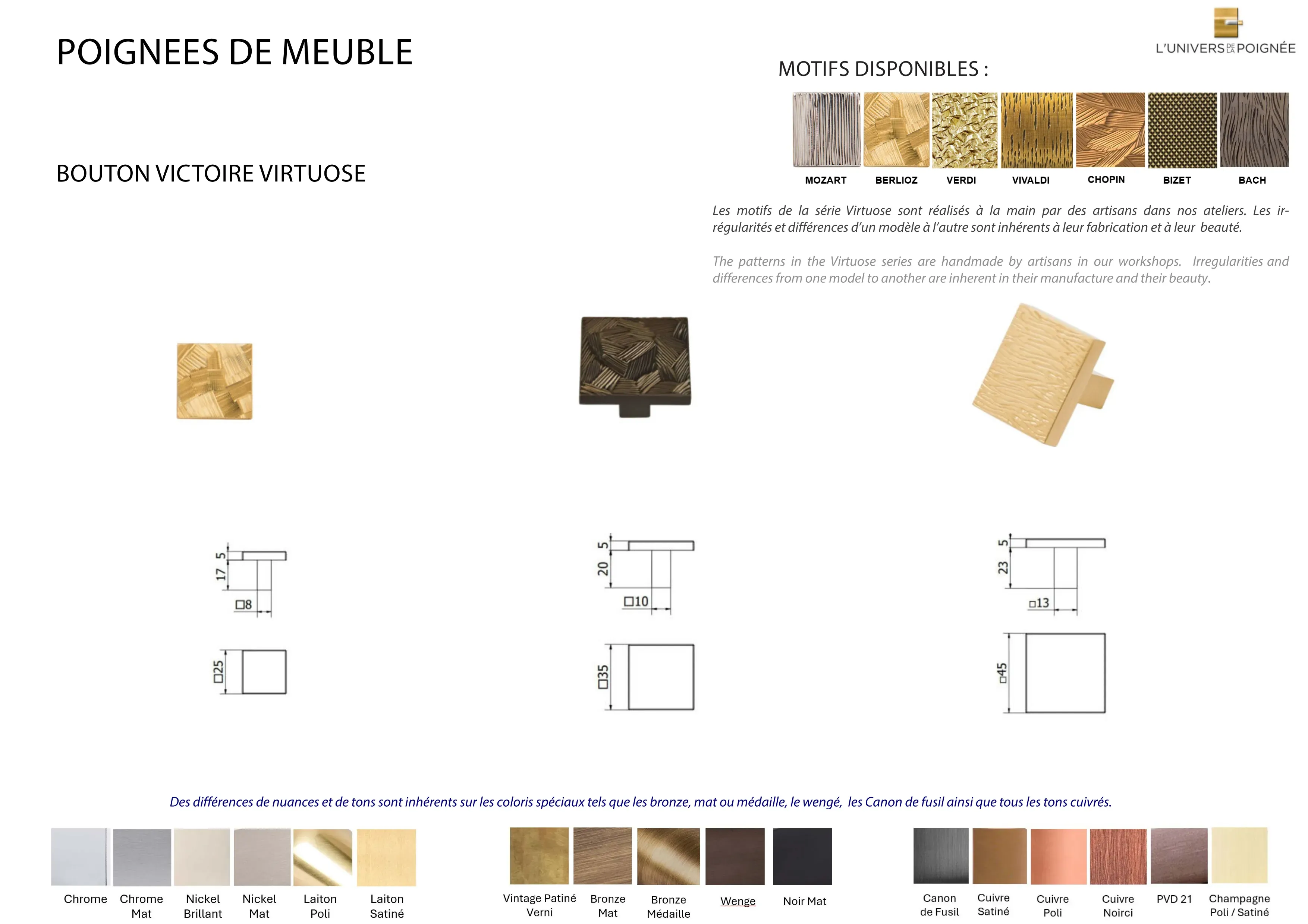 Parce que chaque intérieur mérite une finition sur mesure, le bouton de meuble Victoire est disponible en plus de 15 coloris différents, parmi lesquels : Laiton satiné ; Laiton poli ; Chrome mat ; Chrome brillant ; Nickel mat ; Nickel brillant ; Bronze mat ; Bronze médaille ; Bronze vintage ; Wengé ; Blanc ; Noir mat ; Canon de fusil ; Cuivre satiné ; Cuivre brillant ; Cuivre noirci ; Champagne mat ; Champagne brillant