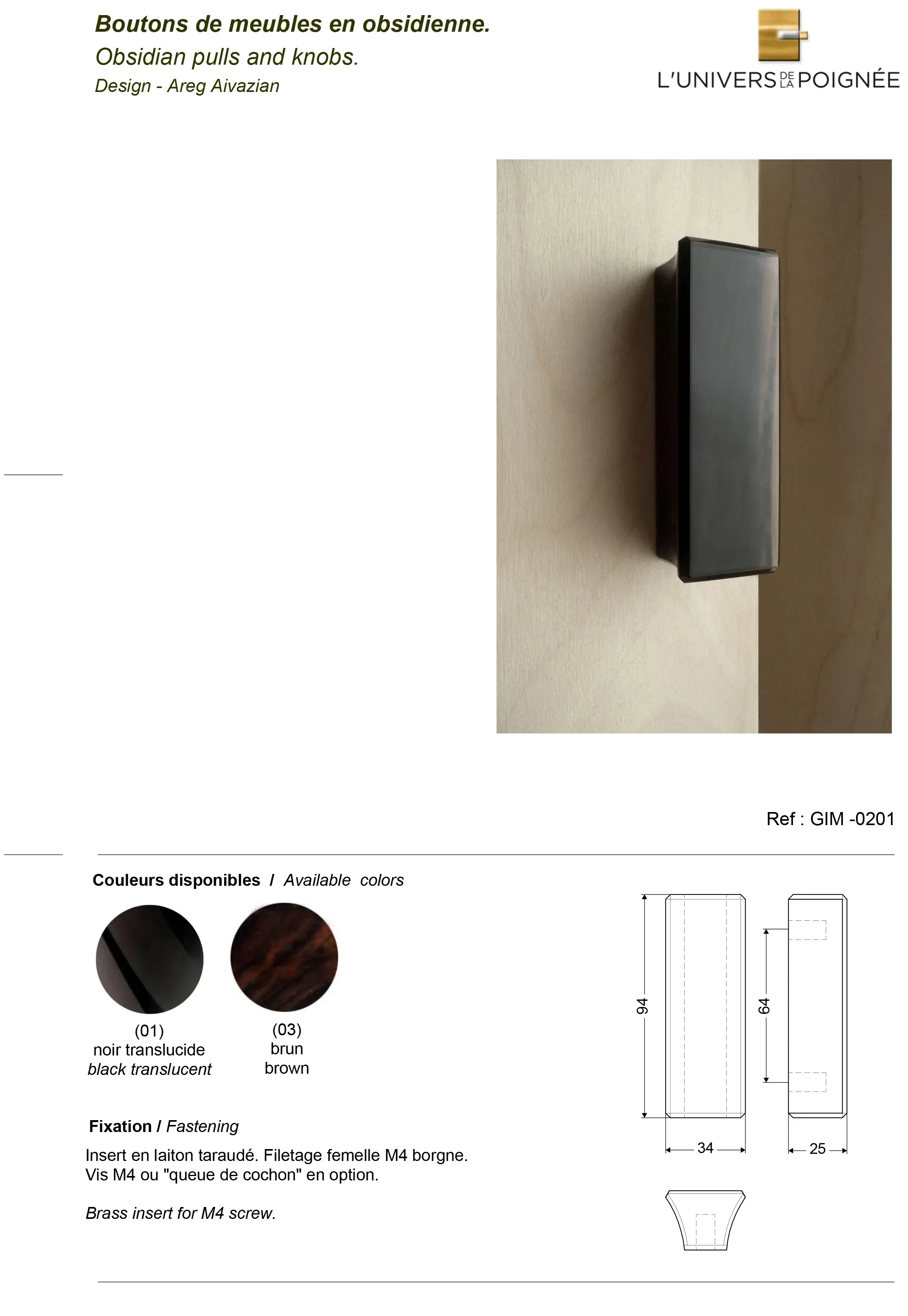 Disponibles en trois finitions selon les modèles – noir translucide, brun et acajou – ces poignées apportent une touche de caractère et d’élégance aux façades de placards et meubles. Leur surface lisse et brillante met en valeur la profondeur et les reflets naturels de la pierre, ajoutant une dimension sophistiquée et unique à chaque pièce.