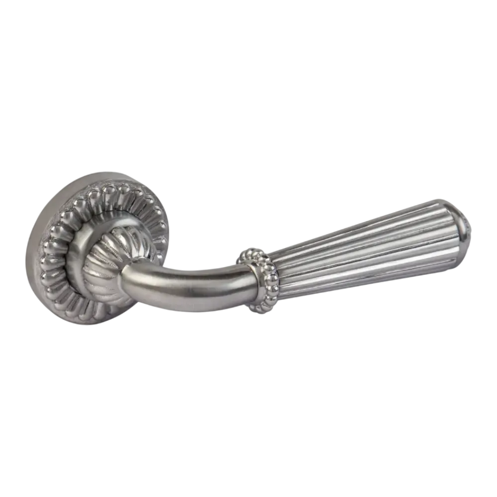 La poignée de porte Konik s’inspire du charme des anciennes demeures, avec un design marqué qui rappelle les poignées traditionnelles des maisons de campagne. Son barreau rond décoré de godrons en saillis assure une prise en main confortable.